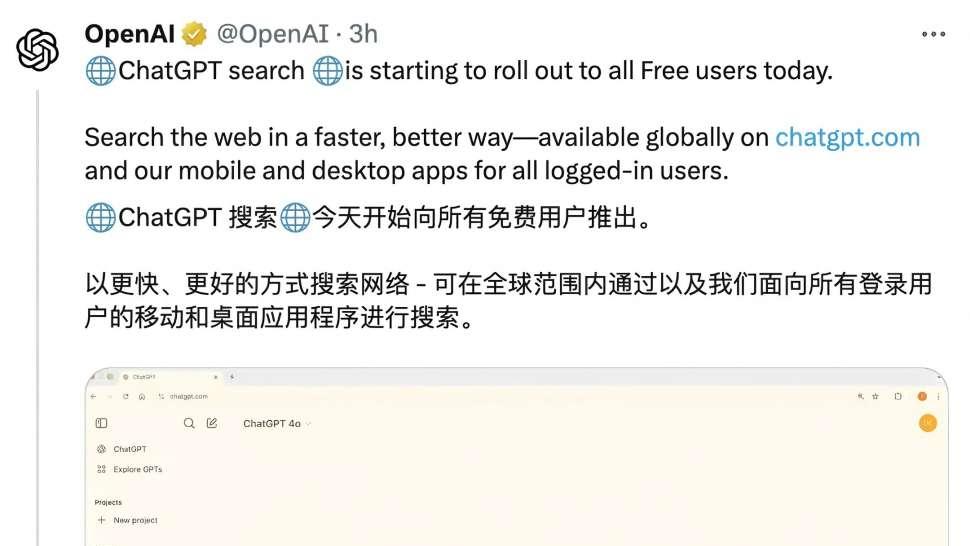 ChatGPT搜索功能向全体用户开放 新增语音搜索服务