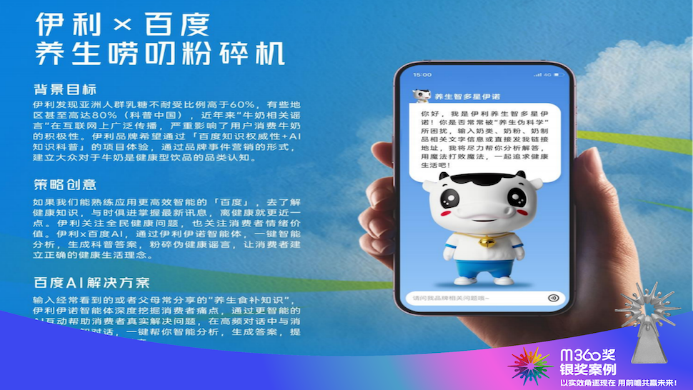 在信息碎片化、谣言自媒体化的时代,乳制品行业长期被各类养生伪科学包围,牛奶谣言反复冲击消费者认知。伊利联合百度凭借大模型 AI 能力,创新打造“养生唠叨粉碎机”,以科技破局谣言,用权威消解误解,用趣味化解家庭代际沟通矛盾,开创快消品牌AI + 知识科普 + 情感沟通的全新范式。