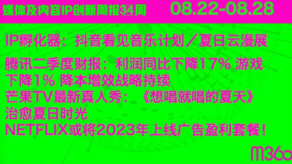 媒体及内容IP创新周报看点 #M360 IP指数排行 综艺/剧集/电影/纪录片/国漫排行榜 #媒体创新趋势 抖音看见【音乐计划】/【夏日云漫展】:虚拟现实歌会 燃魂live 腾讯二季度财报:利润同比下降17%,游戏下降1%,视频号还在快速增长 降本增效战略持续 芒果TV最新真人秀:《想唱就唱的夏天》治愈夏日时光 元宇宙概念房产、NFT暴跌:林俊杰、周杰伦投资亏损80%-95% 作家司