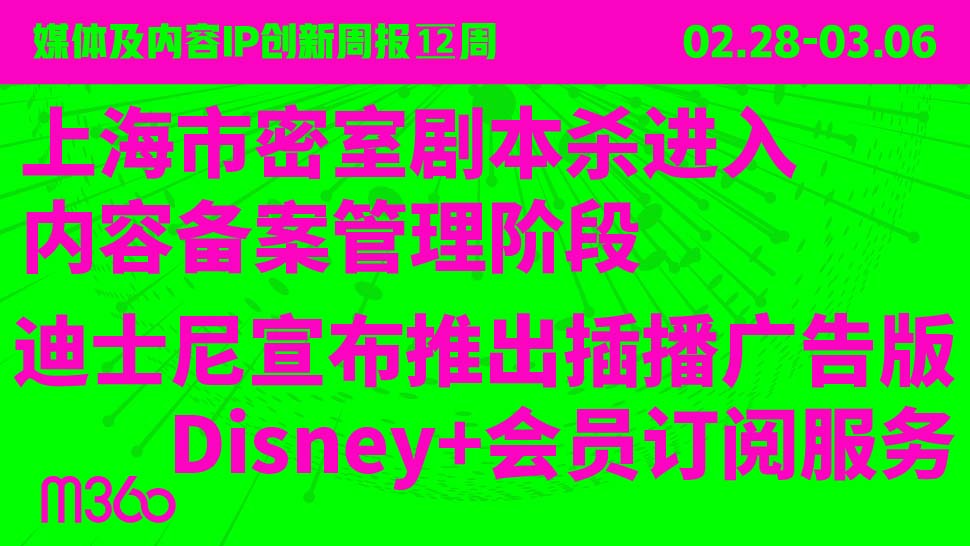 上海市密室剧本杀进入内容备案管理阶段,迪士尼宣布推出插播广告版Disney+会员订阅服务 | 媒体及内容周报