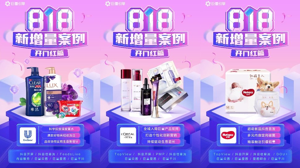 818抖音新潮好物节首日大捷,巴黎欧莱雅、联合利华、好奇、拇指白小T、优形、添可等品牌借巨量引擎全链路营销能力实现开门红。